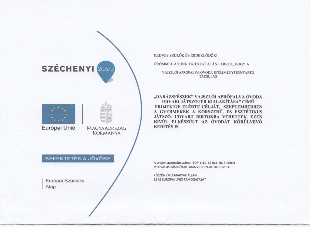 Mint már hírül adtuk az óvoda támogatást nyert az udvar és a körülvevő kerítés felújítására Európai Úniós forrásból. A pályázat azonosítója: TOP-1.4.1-15-BA1-2016-00001. A fejlesztés megvalósítása az óvodai szünetben megkezdődik.